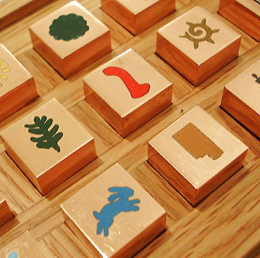 Box of cubes with the PP-FONT alphabet, 2000, enamelled copper, 2 cm side; box in French oak, 31 x 14 x 5 cm