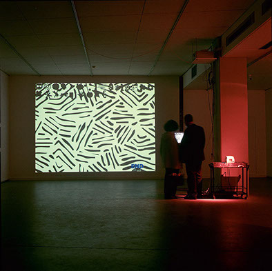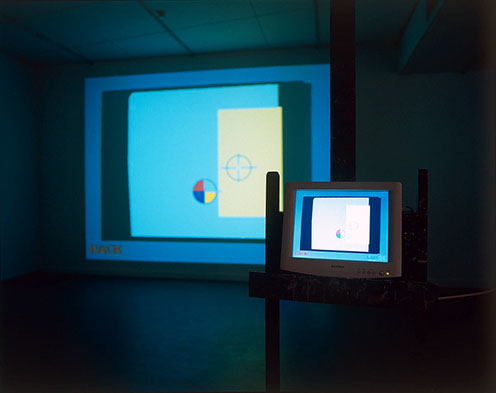 ANCH'IO SON' PITTORE, 1999 (PP-ROM), installation view, software/hardware, touch screen, rear projection screen, easel and printer. Print run of 200 CD-ROMs (Windows 98). FCG, Lisbon