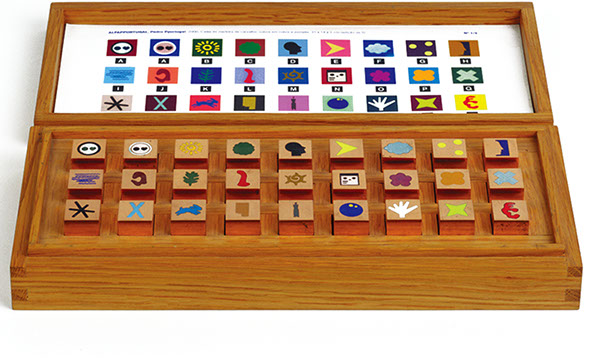 Box of cubes with the PP-FONT alphabet, 2000, enamelled copper, 2 cm side; box in French oak, 31 x 14 x 5 cm