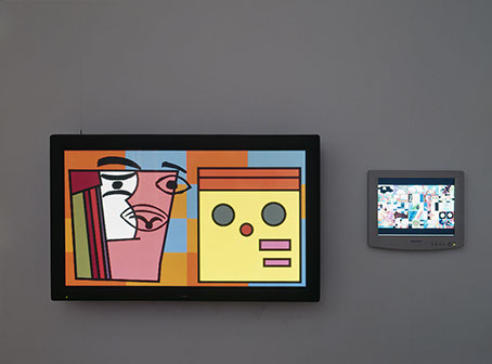 polyptych/instalation, 25 paintings x 62 x 110 cm, acrylic on canvas, software/hardware, plasma screen, touch screen, 310 x 550 cm